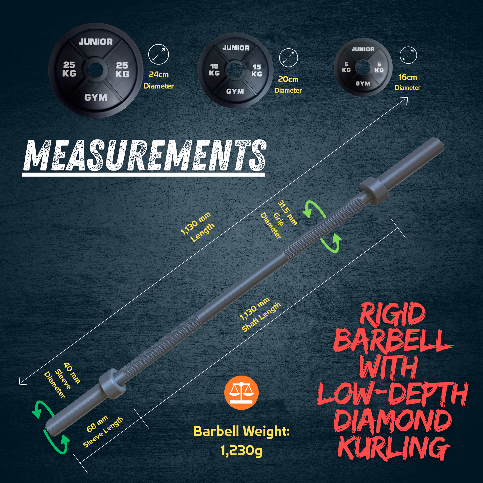 Kids can easily slide the plates on and off, mimicking a real gym setup while building coordination, motor skills, and confidence. The barbell features a low-depth diamond knurling grip, giving a realistic gym feel while remaining safe and comfortable for small hands.